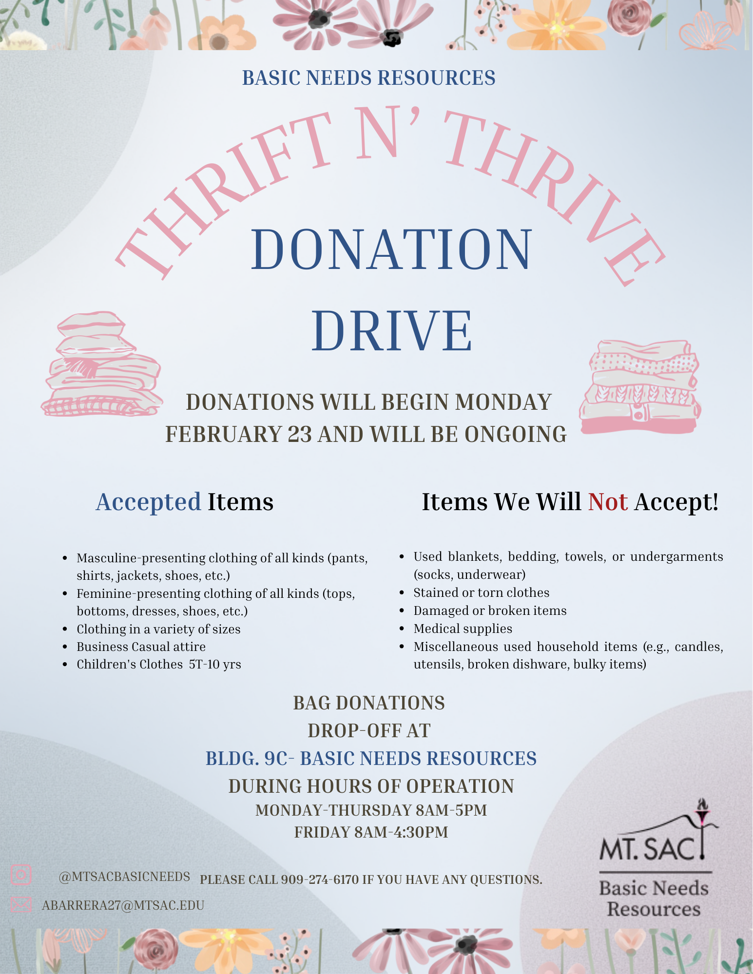 All donations can be dropped off at Building 9C – Basic Needs Resources during our